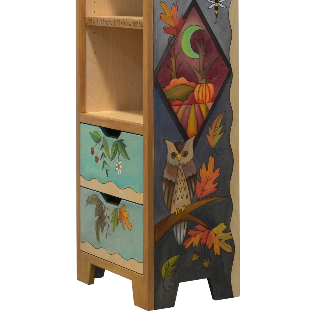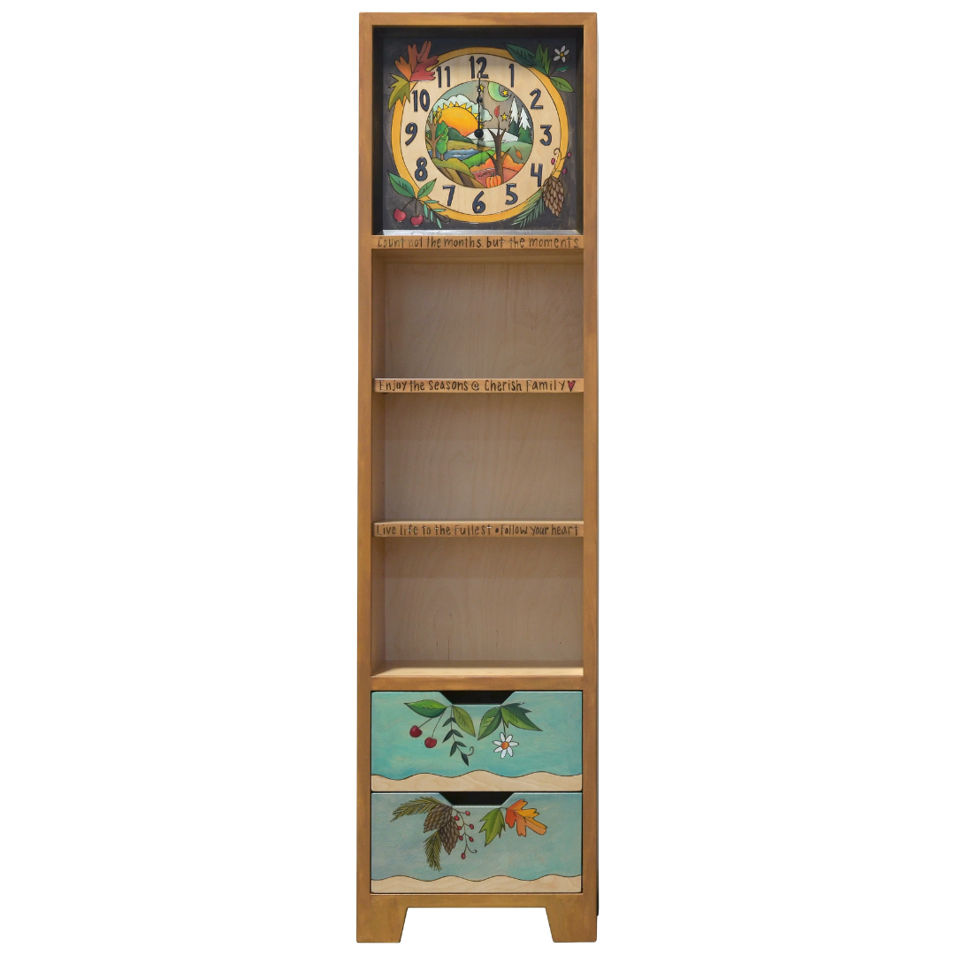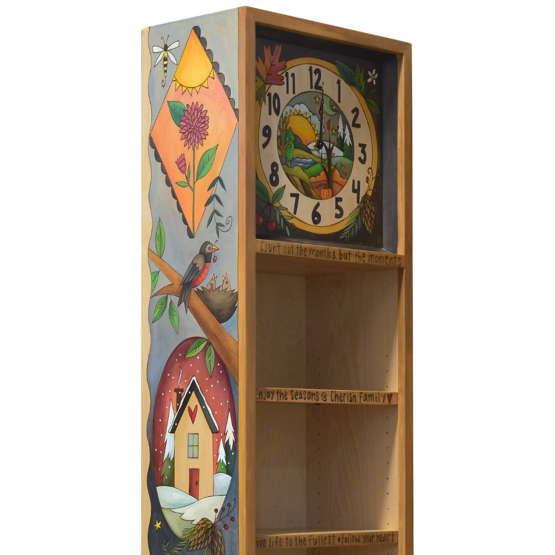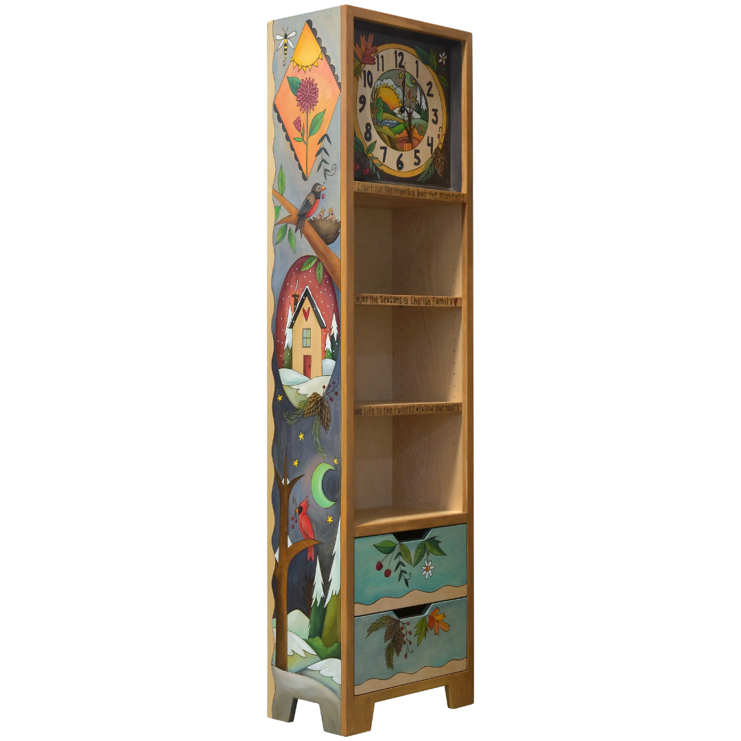 Modern bookcase and clock structure with two drawers with a four seasons motif.
