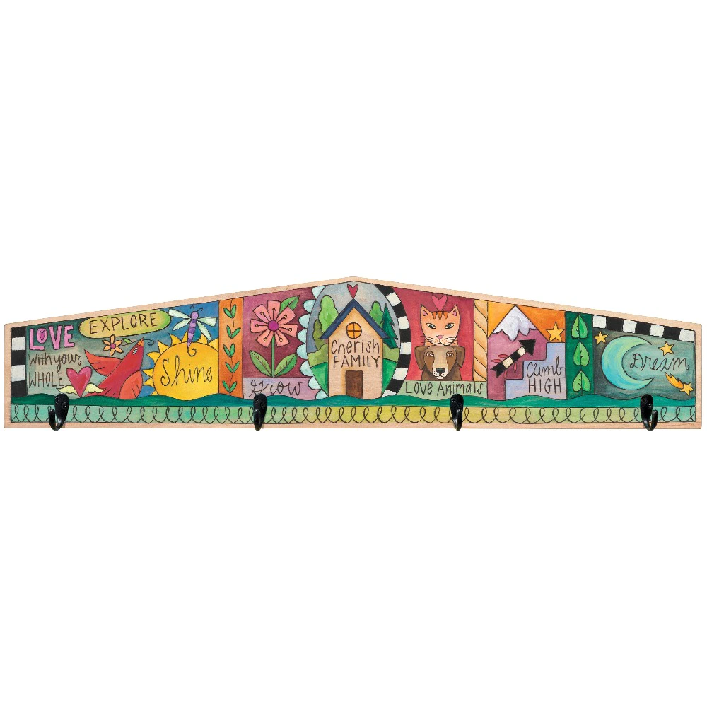 Patchwork design of positive phrases and images on a wood coat rack to hold your belongings.