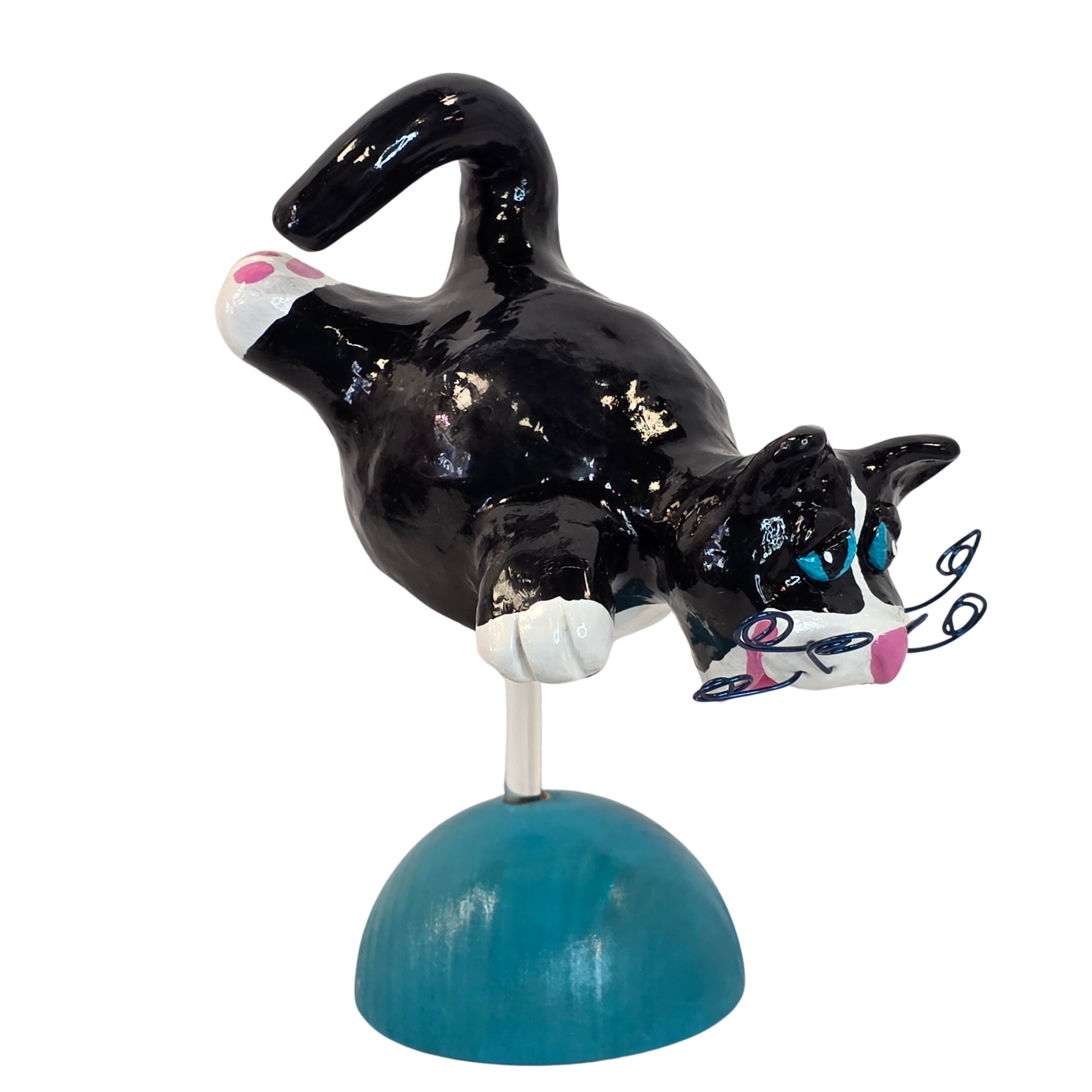 Sculpted using resilient Cosclay over a foil and wire armature. Whimsical wires are twirled for whiskers on these kitties. Each cat comes perched on its own color-coordinate base atop a clear acrylic rod.