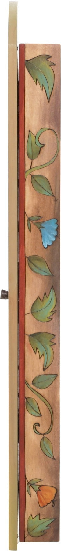 Each piece starts with a wood structure. The artist draws the words and images directly onto the piece. Those drawings are engraved into the wood. Then each color paint or stain is blended, and handpainted onto the structure. Colors are blended and mixed by the artist as the painting evolves, making each piece unique. The design is then sealed with layers of a clear, environmentally safe, protective coating.