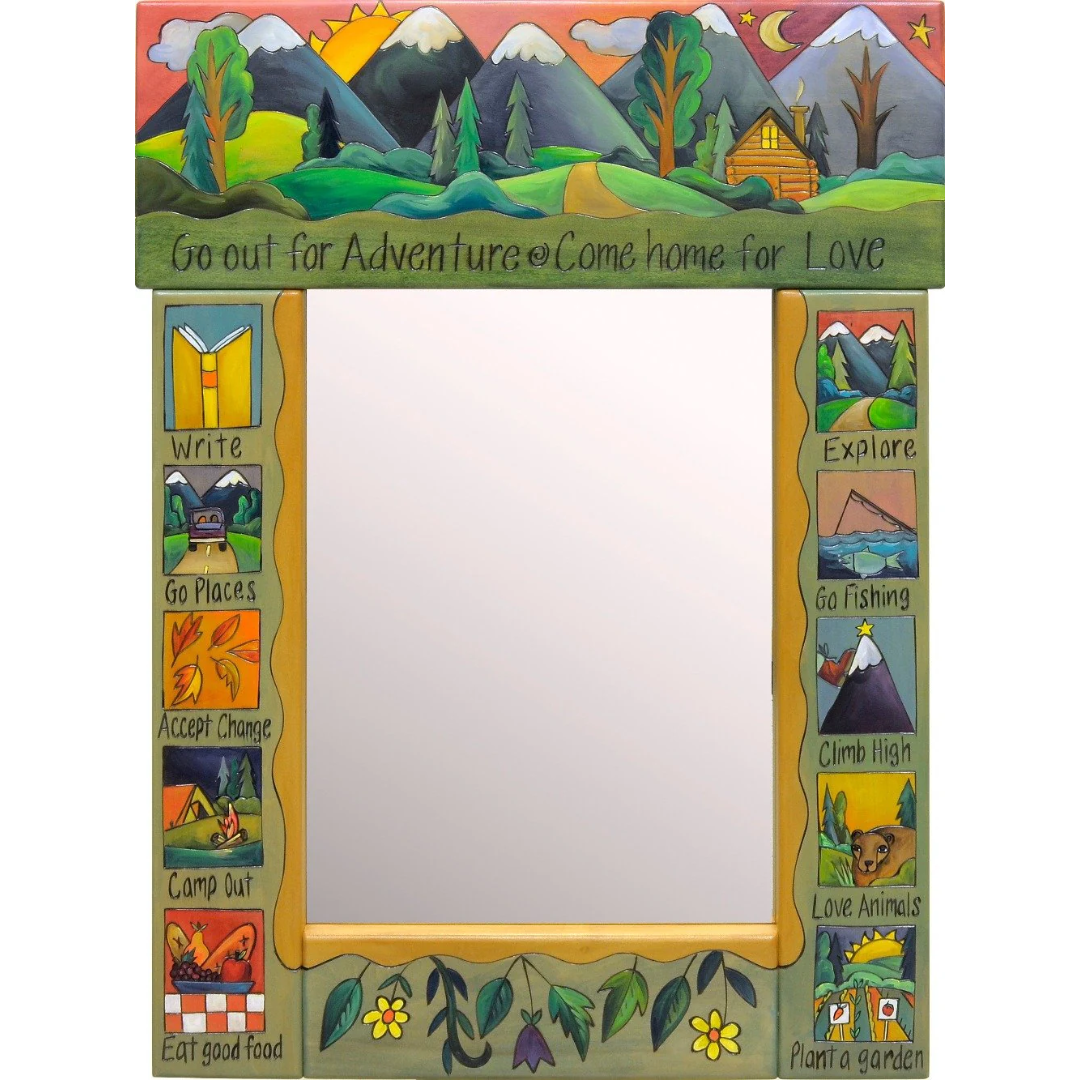 Hand drawn, burned and painted mirror with "Go out for adventure, come home for love" theme with a landscape design.