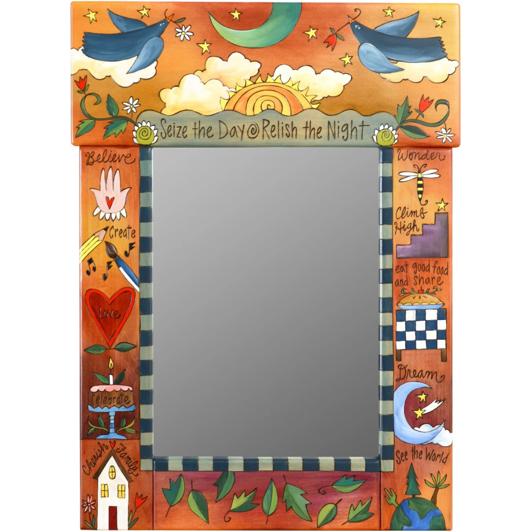 One-of-a-kind, hand painted mirror with a Seize the Day, Relish the Night featuring a sun, moon and love birds.