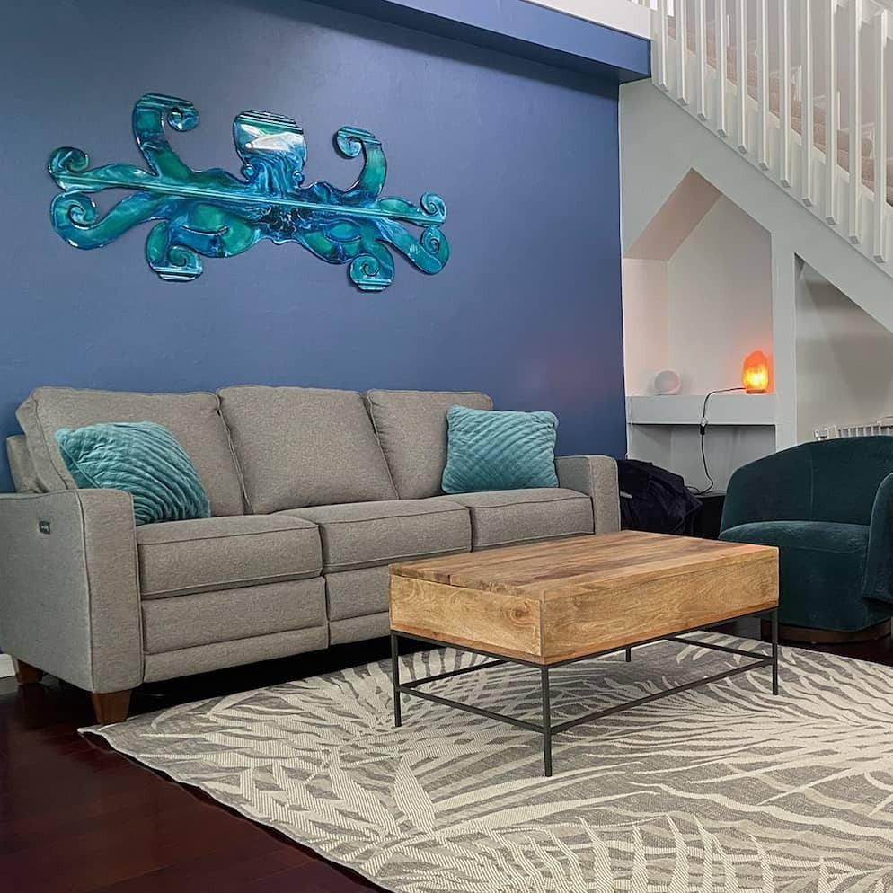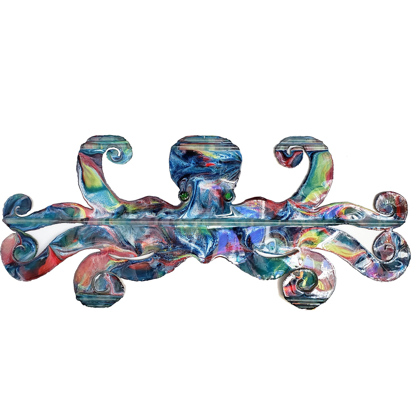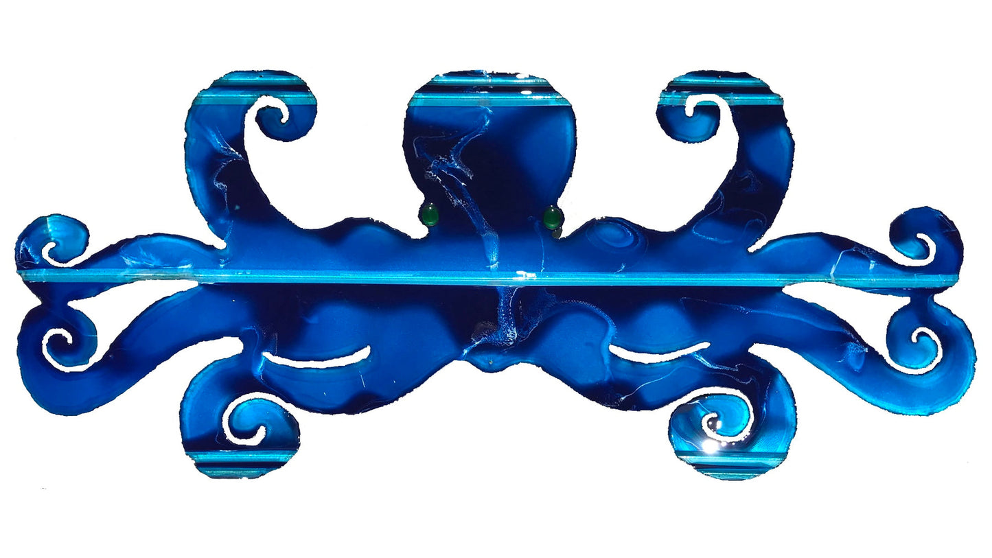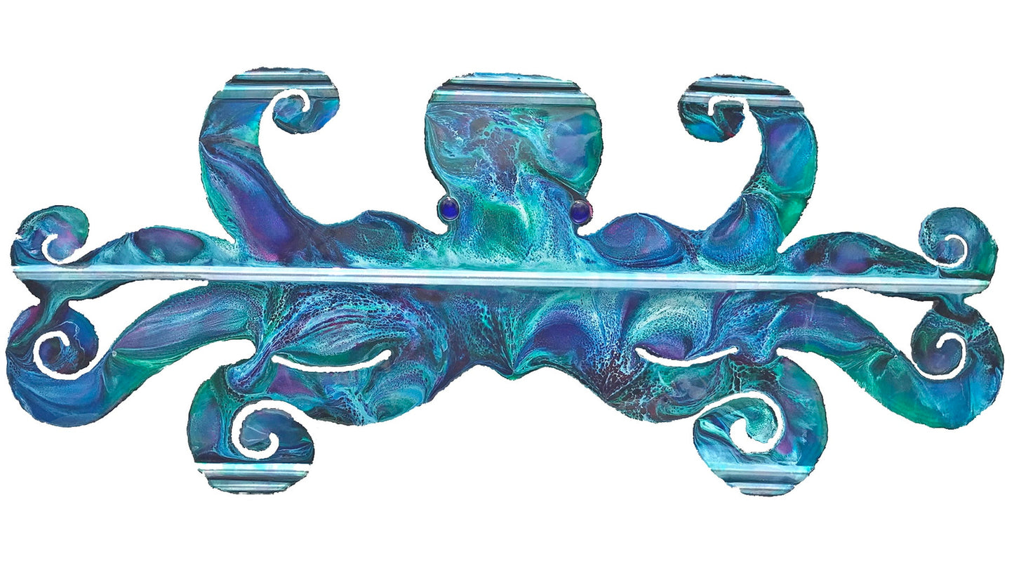The metal is then bent and, where required, welded or soldered into the desired shape. A mixture of enamels, polymers, and sealants are applied and heated. Patterns are created by moving and blending pigments with flame, creating a unique pattern on each piece. By mixing the pigments to be translucent, light travels through and reflects off the metal beneath, creating a vivid, backlit effect.