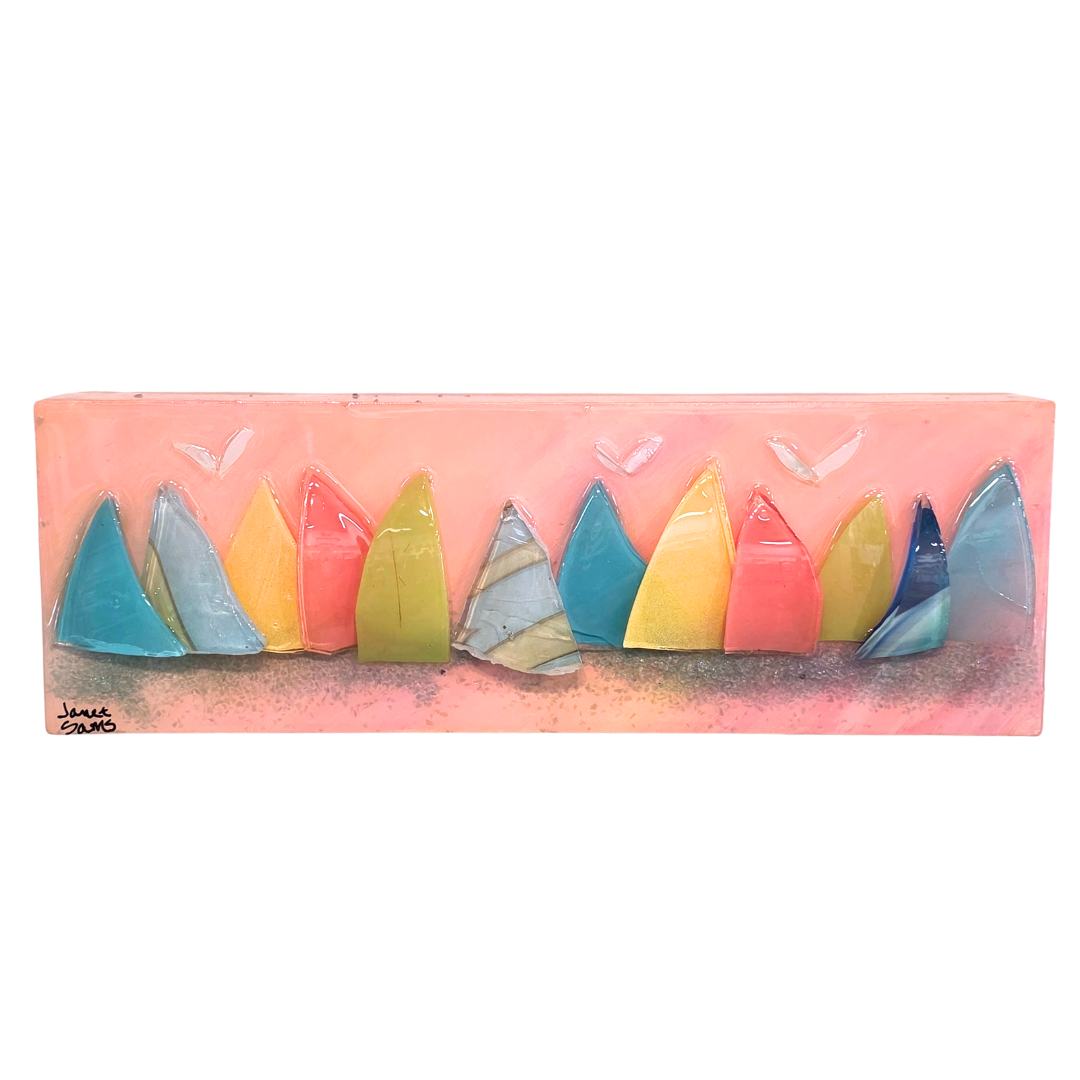 Starting with a hand painted canvas, Florida artist Janet Sams uses reclaimed glass to create her beautiful images. The pieces are then coated in clear resin, both to protect and seal the pieces and to add a glossy, translucent finish to the painted background.