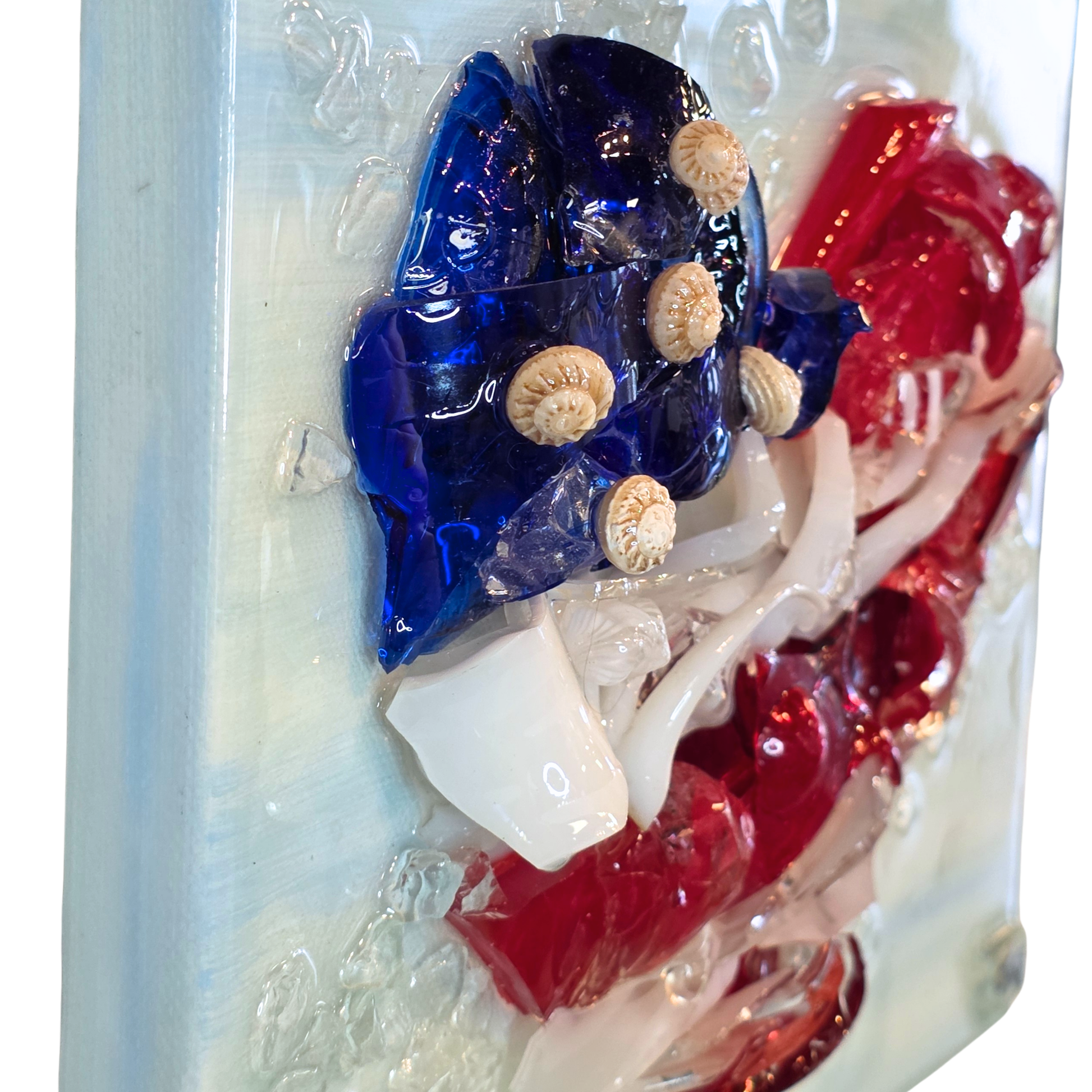 Starting with a hand painted canvas, Florida artist Janet Sams uses reclaimed glass to create her beautiful images. The pieces are then coated in clear resin, both to protect and seal the pieces and to add a glossy, translucent finish to the painted background.