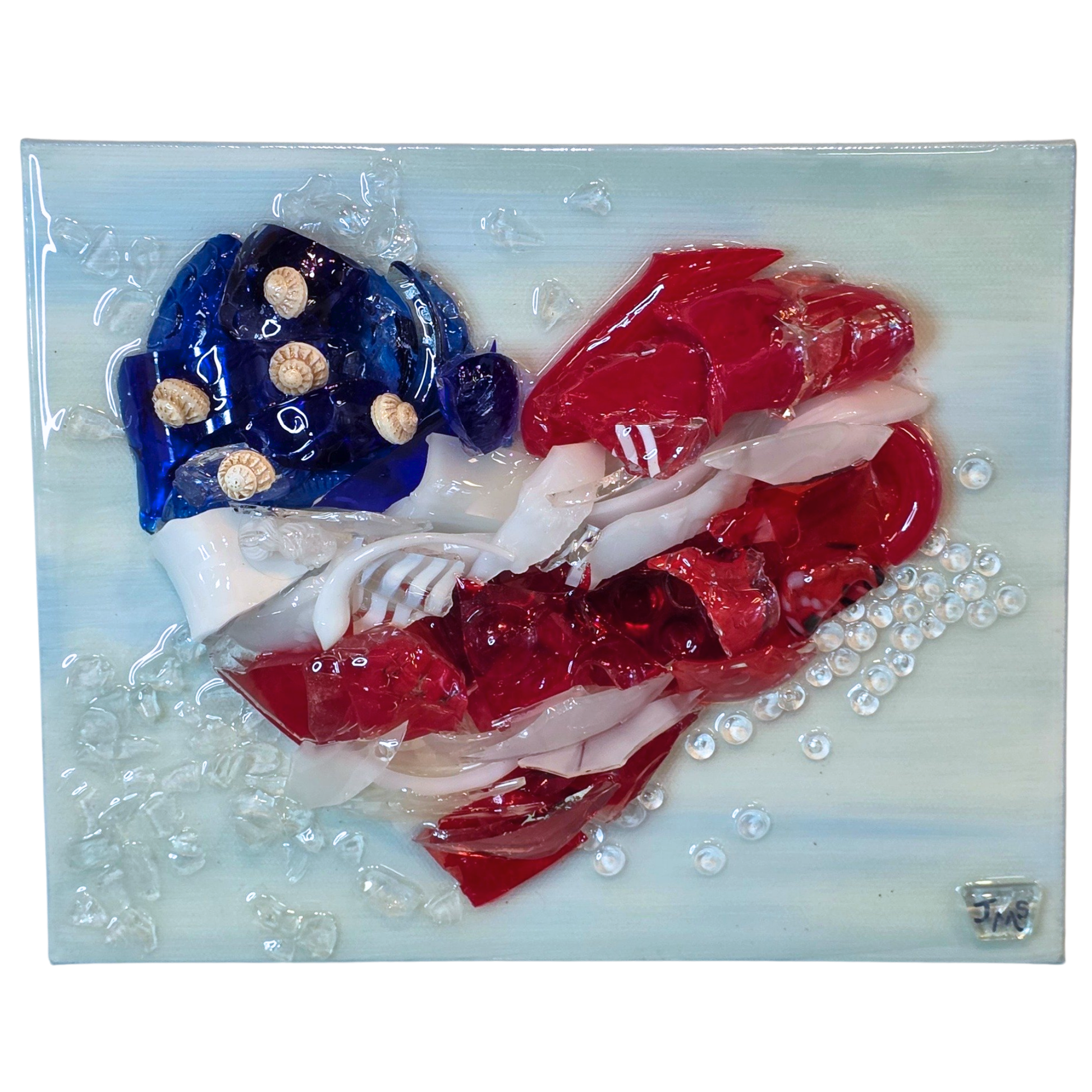 Created from broken glass vases, bowls and lamps in the colors of the American flag.