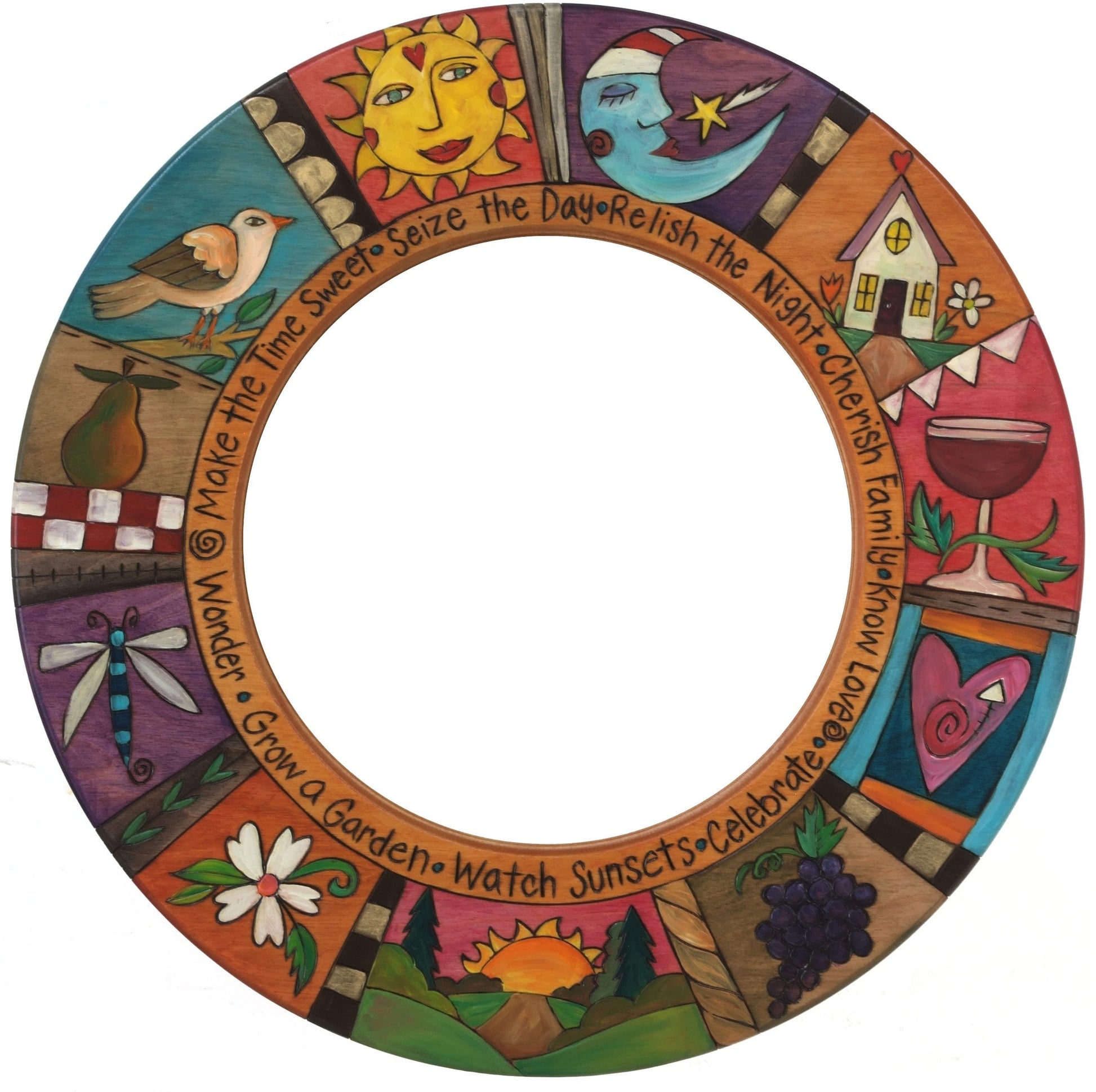 One-of-a-kind, hand drawn, burned and painted mirror with a Seize the day, relish the night theme.