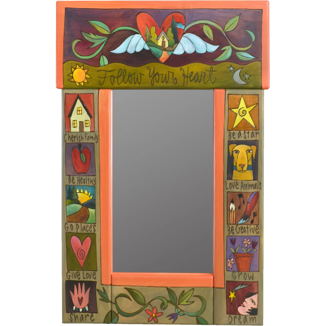 Hand drawn, burned and painted mirror with a Follow Your Heart theme featuring a colorful block icons.