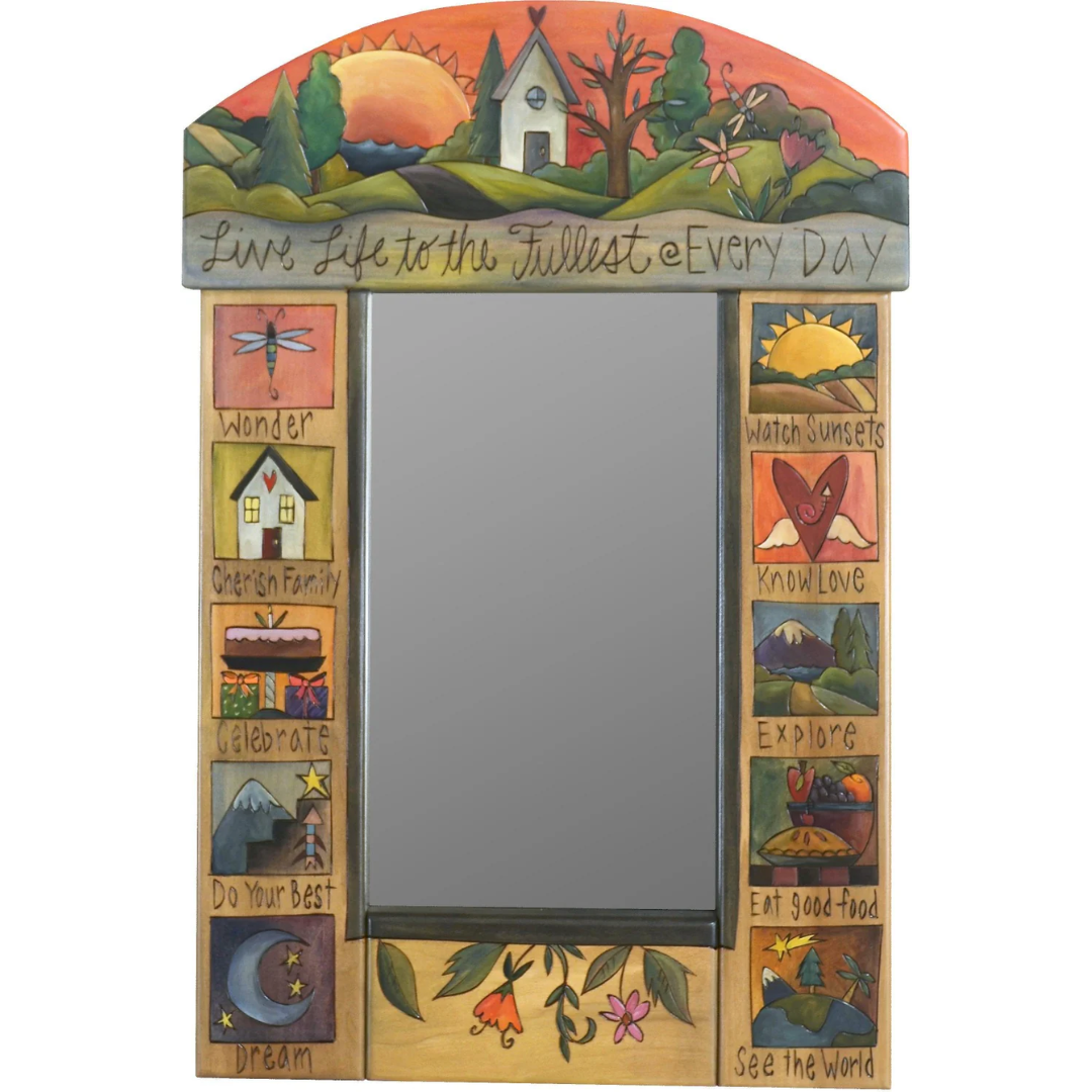 Hand drawn, burned and painted mirror with a "Live life to the fullest EVERY DAY" motif.