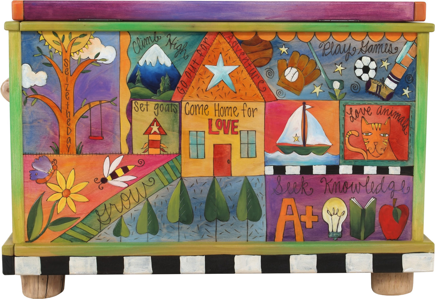 This unique, hand-painted trunk features a "My Stuff" theme with a patchwork-style design and a variety of colorful hues.