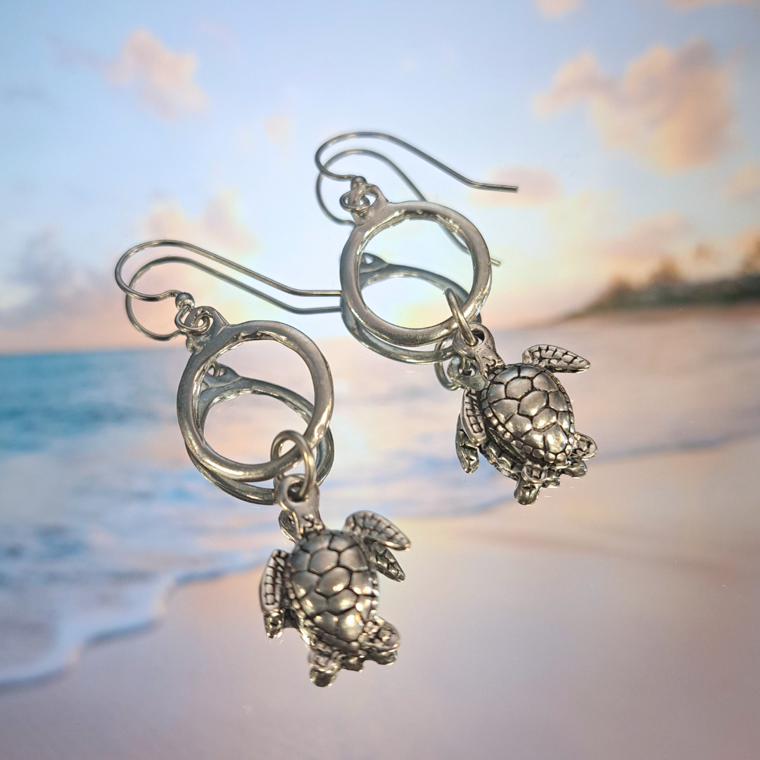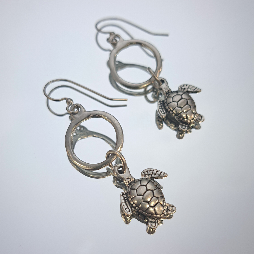 Fun little turtles dangle from a pewter loop.